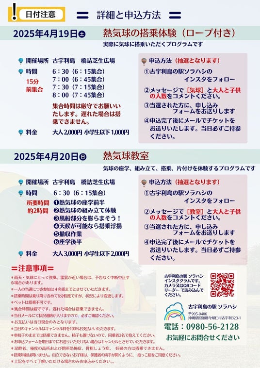 本イベントでは、空から古宇利島の絶景を楽しめる「熱気球搭乗体験」や、熱気球の仕組みを学びながら実際に組み立て・搭乗できる「熱気球教室」を実施します。
