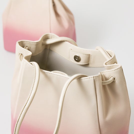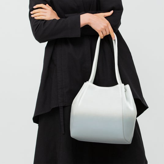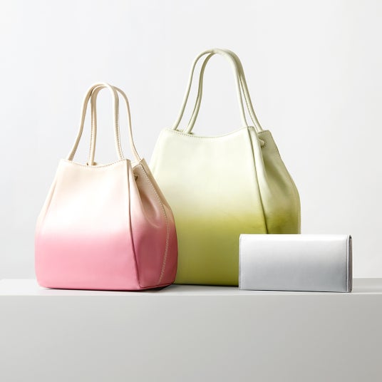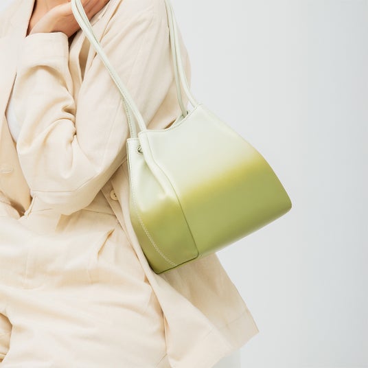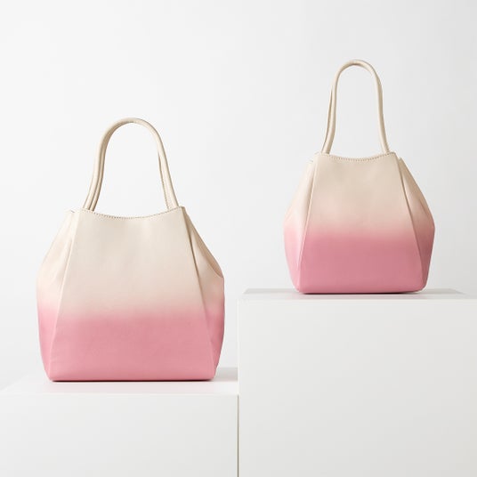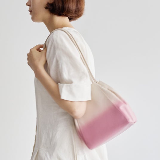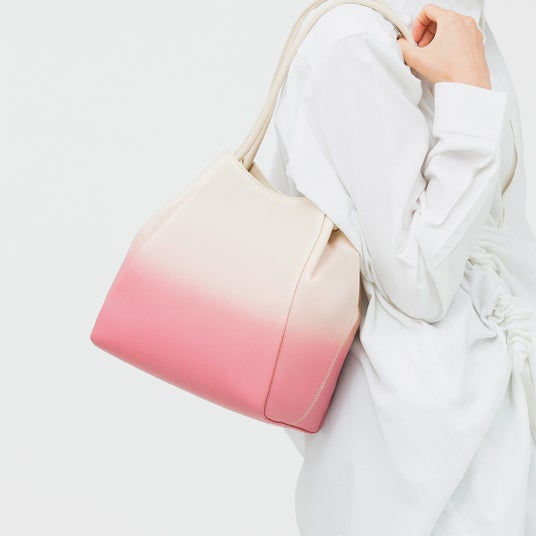 バッグの上部を淡い色あいにすることで、白や黒などのベーシックな服装も、自然とつながりを感じられるスタイリングに。華やかでありながら、日常のスタイルにも自然となじんでくれます。