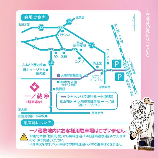 ※JR東北本線「松山町駅」から無料送迎バスを随時往復運行いたしますので、JRでお越しください。