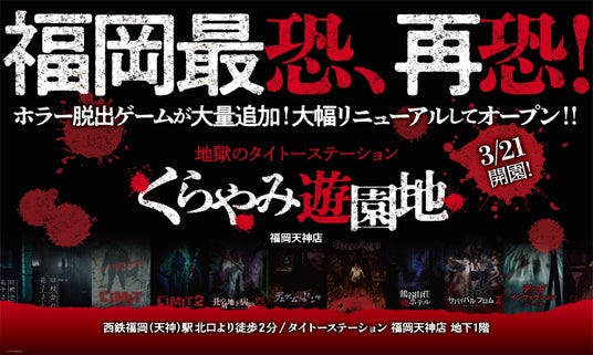株式会社タイトー(本社:東京都新宿区、以下タイトー)がプロデュースする、ミッションクリア型ホラーアトラクション「地獄のタイトーステーション くらやみ遊園地 福岡天神店」(以下、福岡天神店)が大幅にリニューアルし最怖コンテツを取り揃え、3月21日(金)リニューアルオープンいたします。