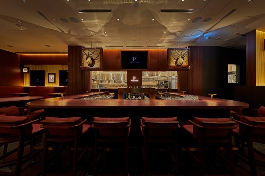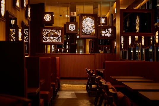 店内は、オーセンティックな英国PUBを想起させる一方で、PUBLICブランドならではのウィットに富んだグラフィックアートが飾られ大阪らしいエネルギーを演出。鹿のはく製が飾られた店のシンボルとなるアイランドバーは、ゲスト同士のボーダーを無くし、心地よい一体感を生み出します。