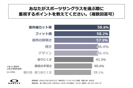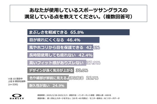 今回の調査により、週1回以上スポーツをする20代~40代の男女の半数以上が、スポーツのプレー中にスポーツサングラスを使用しており、スポーツサングラスを選ぶ際に重視するポイントのトップ3は、1位「紫外線カット率」、2位「フィット感」、3位「視界の鮮明さ」であることがわかりました。また、スポーツをする際にスポーツサングラスを使用している人の中で最も多く使用されているスポーツサングラスのブランドは「オークリー」であり、こうした人の9割強が「スポーツサングラスの使用は、スポーツのパフォーマンスに少なからず良い影響がある」と感じていることが明らかになりました。また、現在使用しているスポーツサングラスの主な満足している点は「まぶしさを軽減できること」や「目が疲れにくくなること」であり、逆に現在使用しているスポーツサングラスの主な不満な点は「長時間使用した際の圧迫感や違和感」や「周りからかっこつけだと言われてしまうこと」であることが判明しました。