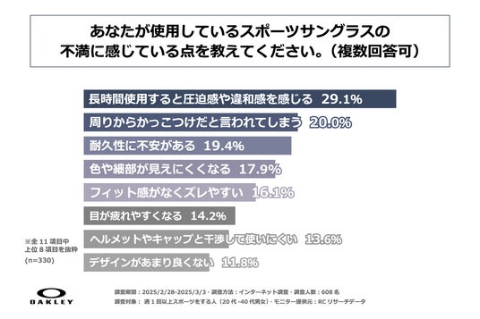 現在使用しているスポーツサングラスの主な不満な点は「長時間使用した際の圧迫感や違和感」や「周りからかっこつけだと言われてしまうこと」