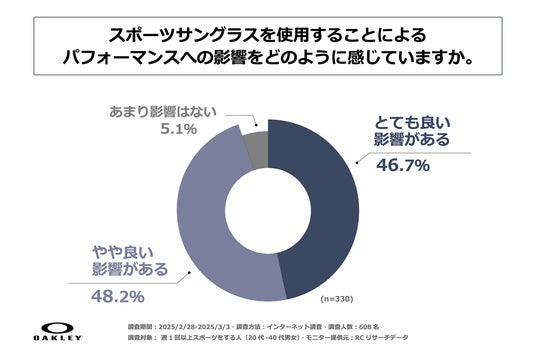 また、スポーツ中にスポーツサングラスを使用すると回答された方に「スポーツサングラスを使用することによるパフォーマンスへの影響をどのように感じているか」を尋ねる設問の回答では、1位が「やや良い影響がある」で48.2%、2位が「とても良い影響がある」で46.7%という結果になりました。1位と2位の回答を合計すると回答率約95%となり、約95%の人がスポーツサングラスの使用は、「スポーツのパフォーマンスへ少なからず良い影響がある」と感じていることが判明しました。
