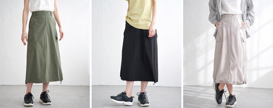 ●特 長:トレンドのカーゴスカートは、ナイロン素材で軽く、汗ばむ時期もサラッと快適素材を使用。裾にはドロスト仕様を施し、AラインでもIラインでもシルエットのアレンジ可能です。