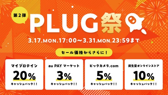 「PLUG祭」第二弾開催!~マイプロテイン、au PAY マーケット、ビックカメラ、資生堂オンラインで最大20%キャッシュバック~