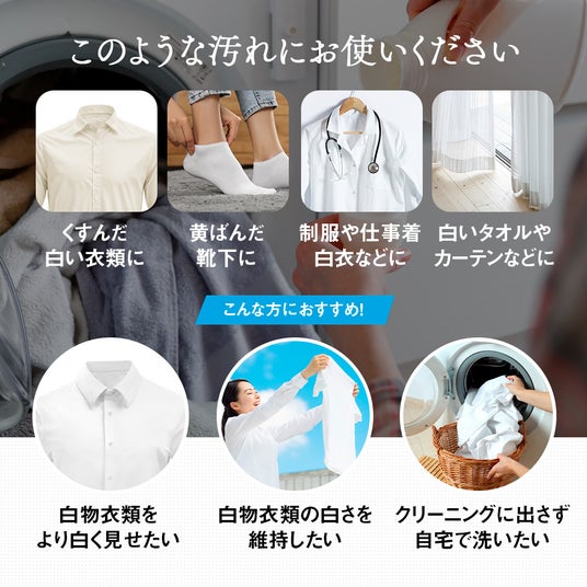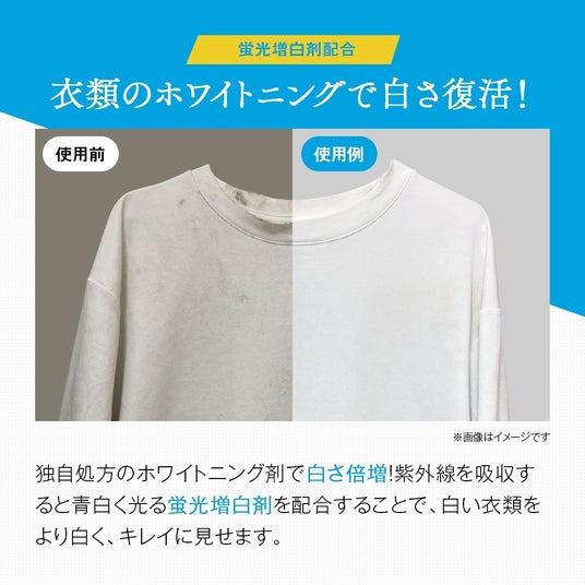 浸透洗浄+ホワイトニング効果で、くすんだYシャツや制服、靴下などの衣類をより白く見せます。