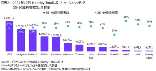 2024年12月のMonthly Totalレポートによると、ソーシャルメディアにおいて、利用者数が最も多かったのは「LINE」で8,183万人、「Instagram」が6,062万人、「Twitter X」が5,677万人で続いていました。また、月平均利用回数は「LINE」が月754回で最も多く、「Twitter X」が月191回、「Instagram」が月178回で続いていました(図表1)。
