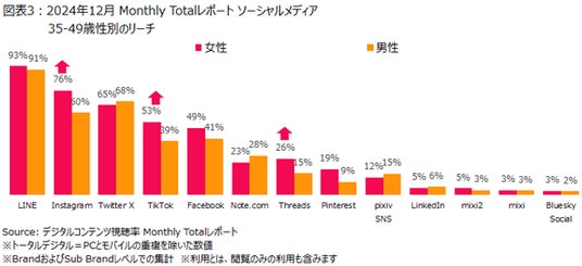 - 35-49歳のうち、「Instagram」「TikTok」「Threads」は男性よりも女性のリーチが高い