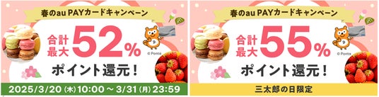 さらに、抽選で 200 名さまに、当選内容に応じて、最大 35%の Ponta ポイント(au PAY マーケット限定)があたります。実施中のキャンペーンや特典とあわせると合計最大 52%のポイント還元、さらに三太郎の日(2025年3 月 23 日)なら合計最大 55%のポイント還元となるチャンスがあります。