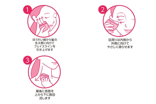 スキンケアの最後の仕上げにご使用ください。1.2.3.の順で肌に滑らせるように塗布します。
