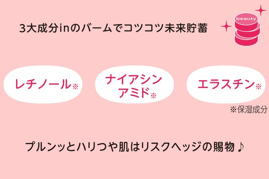3種の保湿成分、レチノール、ナイアシンアミド、エラスチンを配合。プルンッとハリつや肌へ。