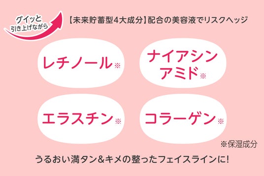 “未来貯蓄型4大成分”レチノール、ナイアシンアミド、エラスチン、コラーゲンを配合。グイッと引き上げながら、うるおい満タン&キメの整ったフェイスラインに!