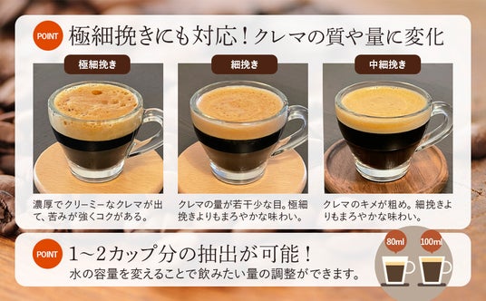 2 極細挽き対応にも対応。挽き方によりクレマの質、量、味、風味に変化が起き、自分好みの味を見つけることができます。また、水の容量を変えることで1~2カップ分の抽出が可能に。水の容量を変えることでもクレマや味に変化をつけることができます。