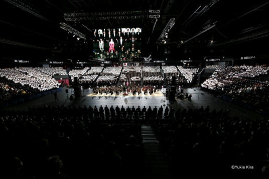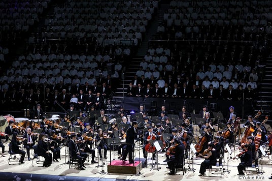 「3000人の合唱」を目標に掲げ、昨年5月から全国で参加者を募集してきた本イベント。当初は地方都市では無謀な試みと言われた企画でしたが、コンサート当日には北海道から九州までの各地から小学1年生から94歳までの幅広い世代が会場に集まり、アリーナの半数ちかくを合唱団が埋め尽くしました。目標人数には届かなかったものの、その規模は全国でもトップクラスとなり、サントリー1万人の第九や国技館5000人の第九に次ぐ大舞台として注目を集めました。