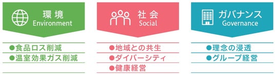 「Eat+&の幸せ」を、将来へと持続させていくために、「事業への影響」と「社会への影響」を考慮した「マテリアリティ(重点課題)」に基づき、「環境」「社会」「ガバナンス」の3つの視点より、7つの重点取組みテーマを選定。7つの分科会ごとに、取り組みを推進しています。