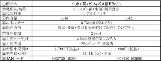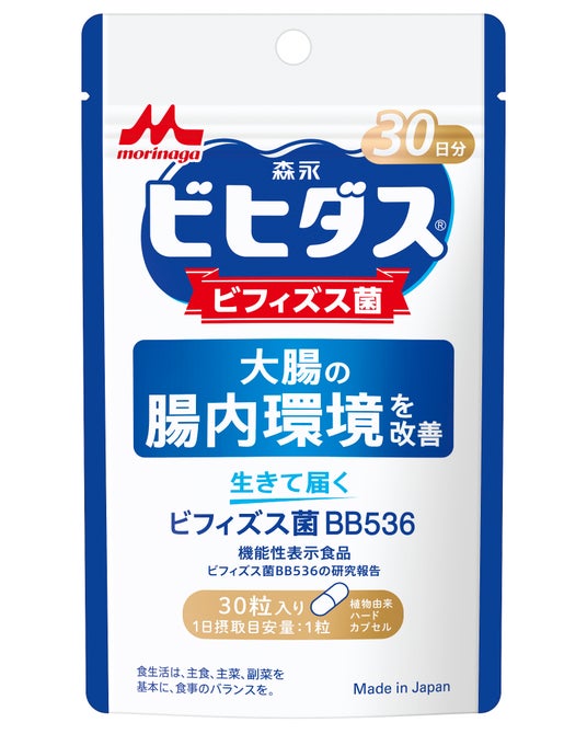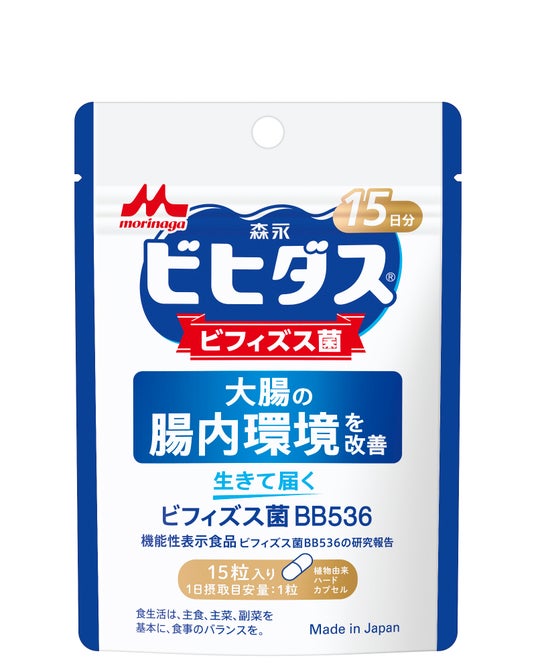 「生きて届くビフィズス菌BB536」はカプセルタイプで生きたビフィズス菌BB536が手軽に摂れるサプリメントです。このたび使用するカプセルを耐酸性の植物由来カプセルに変更し、胃酸に負けず、ビフィズス菌BB536がより生きて腸に届くようリニューアルいたします。また、パッケージも「ビヒダス」シリーズであることが一目でわかるようなデザインにリニューアルしました。