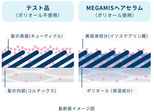 そこで当社は、毛髪の脂質成分であるイソステアリン酸に着目。ヘアアイロンやブリーチの使用などでハイダメージを受けた毛髪をモデルに研究を重ね、より多くのイソステアリン酸を届ける高濃度浸透処方を実現したヘアセラムを開発しました。トリートメントでとじる前にヘアセラムを塗り、その上からトリートメントでパックする新習慣(※5)で、女神級にまとまるツヤ髪へと導くヘアケアブランド『MEGAMIS』を新発売します。