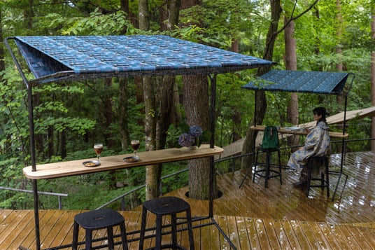 森の中に位置するクラウドテラスは、木々から雨が落ちる音や、風とともに雨が降る音、雨が枝に打ちつける音など、さまざまな雨音を楽しめる空間です。その中に、雨音が心地良く響き、音の重なりを楽しめる屋根を取り付けた「雨音カウンターテーブル」を用意しました。森の中でリラックスしながら、雨音に耳を傾け、自然の旋律を感じ、ゆっくりとした時間を過ごします。