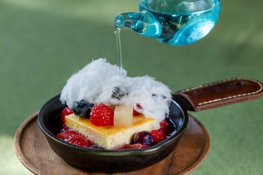 「雨の森のひととき」では、雨雲のような綿あめをのせたチーズケーキを用意しました。雨に見立てたソースをかけて、雲を溶かす仕掛けも楽しめます。ベリーの甘酸っぱさがアクセントになっており、梅雨の森の景色をイメージした1品です。雨で潤った森の幻想的な景色を眺めながら、コーヒーや紅茶の温かい飲み物とともに味わいます。