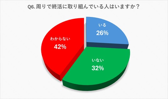 「周りで終活に取り組んでいる人はいますか?」の質問には、「いる(26%)」「いない(32%)」「わからない(42%)」という回答になりました。