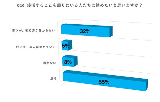 「終活することを周りにいる人たちに勧めたいと思いますか?」の質問には、「思う(55%)」「思わない(8%)」「既に周りの人に勧めている(5%)」「思うが、勧め方が分からない(32%)」という回答になりました。
