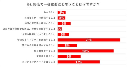 「終活で一番重要だと思うことは何ですか?」の質問には、「エンディングノートを書くこと(17%)」「遺言書を書くこと(9%)」「生前整理をすること(23%)」「預貯金や財産を調べておくこと(8%)」「今後のライフプランを計画すること(25%)」「介護や医療について考えること(5%)」「遺影写真の準備やお葬式、お墓の準備をすること(2%)」「終活の専門家に相談すること(5%)」「終活セミナーで勉強すること(3%)」「わからない(3%)」という回答になりました。