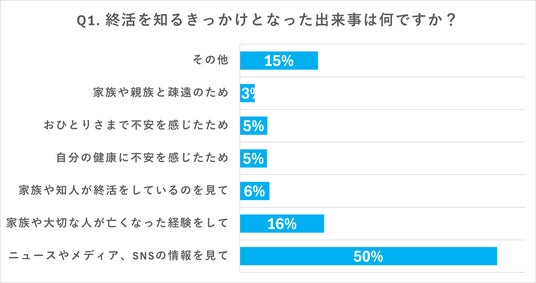 「終活を知るきっかけとなった出来事は何ですか?」の質問に対して、「ニュースやメディア、SNSの情報を見て(50%)」「家族や大切な人が亡くなった経験をして(16%)」「家族や知人が終活をしているのを見て(6%)」「自分の健康に不安を感じたため(5%)」「おひとりさまで不安を感じたため(5%)」「家族や親族と疎遠のため(3%)」「その他(15%)」という回答になりました。