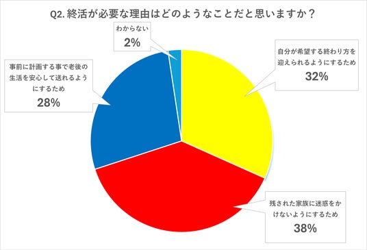 「終活が必要な理由はどのようなことだと思いますか?」の質問には、「自分が希望する終わり方を迎えられるようにするため(32%)」「残された家族に迷惑をかけないようにするため(38%)」「事前に計画する事で老後の生活を安心して送れるようにするため(28%)」「わからない(2%)」という回答になりました。