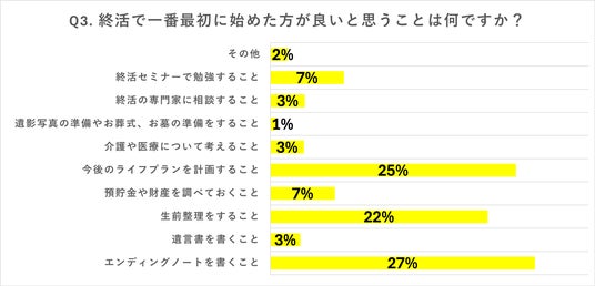 「終活で一番最初に始めた方が良いと思うことは何ですか?」の質問には、「エンディングノートを書くこと(27%)」「遺言書を書くこと(3%)」「生前整理をすること(22%)」「預貯金や財産を調べておくこと(7%)」「今後のライフプランを計画すること(25%)」「介護や医療について考えること(3%)」「遺影写真の準備やお葬式、お墓の準備をすること(1%)」「終活の専門家に相談すること(3%)」「終活セミナーで勉強すること(7%)」「その他(2%)」という回答になりました。