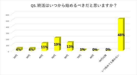 「終活はいつから始めるべきだと思いますか?」の質問には、「20代(4%)」「30代(4%)」「40代(11%)」「50代(19%)」「60代(13%)」「70代(1%)」「80代(0%)」「90代以降(0%)」「いつ始めても構わない(48%)」という回答になりました。