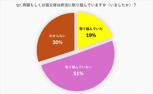 「両親もしくは祖父母は終活に取り組んでいますか(いましたか)?」の質問には、「取り組んでいた(19%)」「取り組んでいない(51%)」「わからない(30%)」という回答になりました。