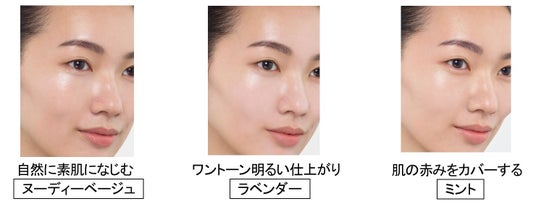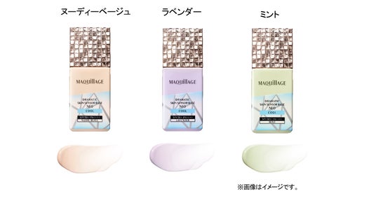 限定クールタイプは通常品「ドラマティックスキンセンサーベース NEO」のくずれ防止効果、毛穴補正効果、スキンケア効果はそのままに、3種の清涼成分を配合することで、夏に気持ちよく使えるひんやり感を搭載しました。さらに夏らしい爽やかな香りをプラスし、盛夏期においても快適にメイクを楽しんでいただける仕様となっています。色調は自然に素肌になじむヌーディーベージュ、ワントーン明るい仕上がりのラベンダー、赤みをカバーする効果のあるミントの3色展開です。