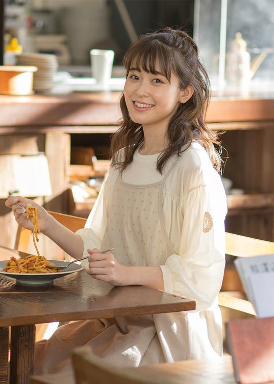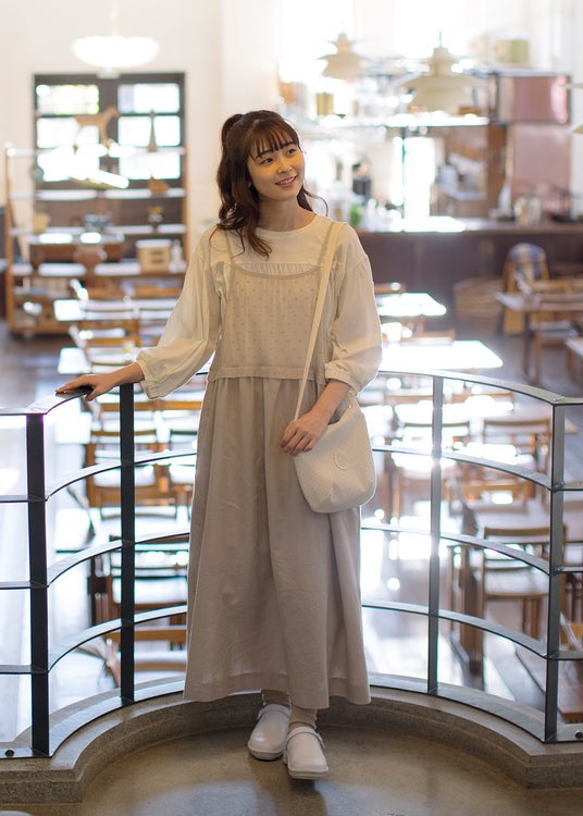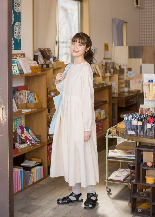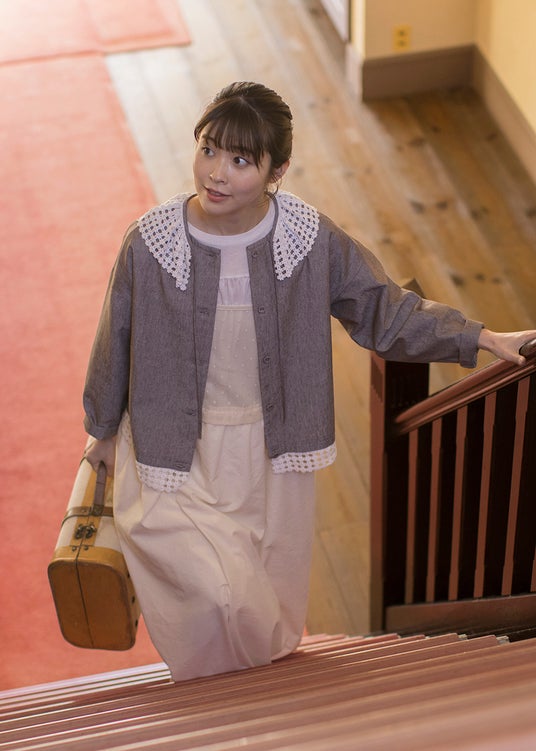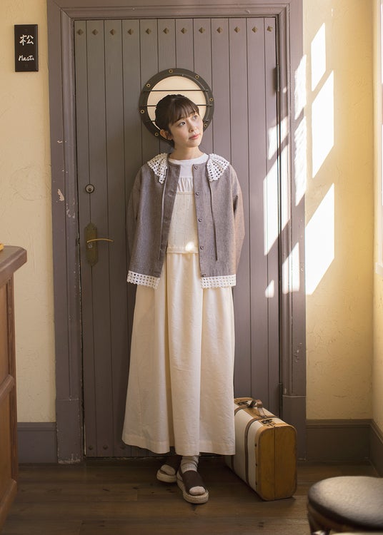 また、無地とドット柄のアソート展開で取り揃えたワンピースは、肩のピンタックとウエストの切り替えがポイント。ふんわりとしながらも横から見たときには上品な印象になるよう仕上げました。そのほか、悩まずにコーディネートが完成する万能なカットソー付きキャミワンピースと、レース襟付のブラウスをご用意しております。