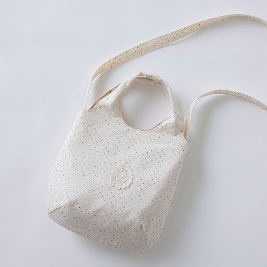 さらに今回、本コラボアイテムを店舗にてお買い上げのお客様に「オリジナルショルダーバッグ」をプレゼントいたします。レトロなドット柄にチューリップレースをあしらった特別なバッグは春のおでかけにぴったりです。