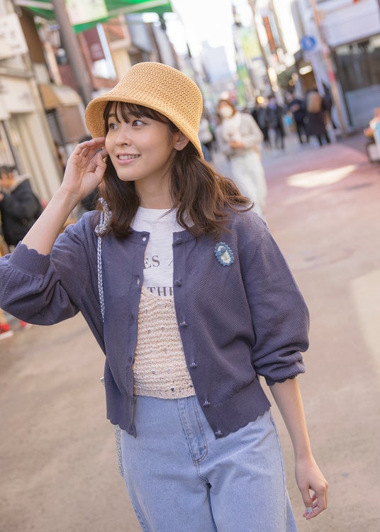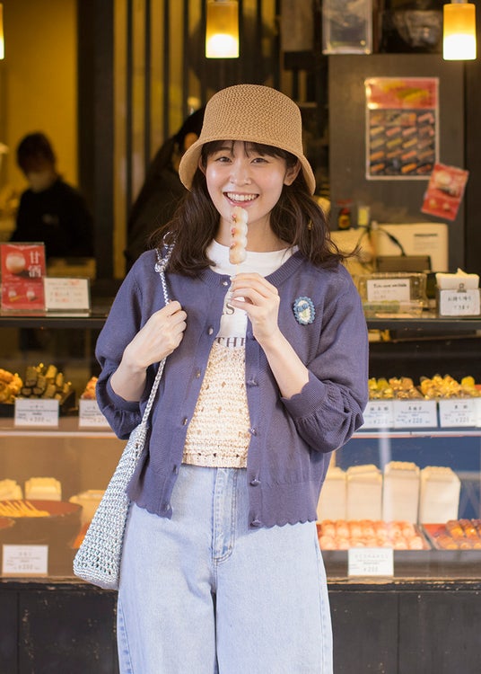 以前のコラボで大人気だったカーディガンは、スカラップデザインを加えて大人可愛いデザインにアップデート。麻混素材を採用し、春夏の気温調整にぴったりなアイテムです。ゆべしさんのトレードマークでもある“チューリップ”をモチーフにしたセットのブローチの色使いにもこだわりました。