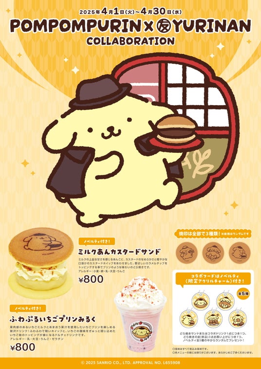 YURINAN では、4月1日(火)から「ポムポムプリン」とコラボしたどら焼きサンドやドリンク、グッズを発売いたします。