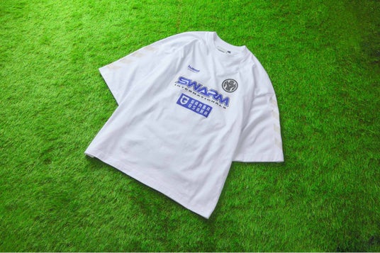 オーバーサイズのホワイトTシャツはコットン100%の厚手生地が特徴。胸スポンサー位置のSWARMは「群衆」を意味。スタジアムに集まる熱狂的なサポーターを表しています。