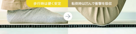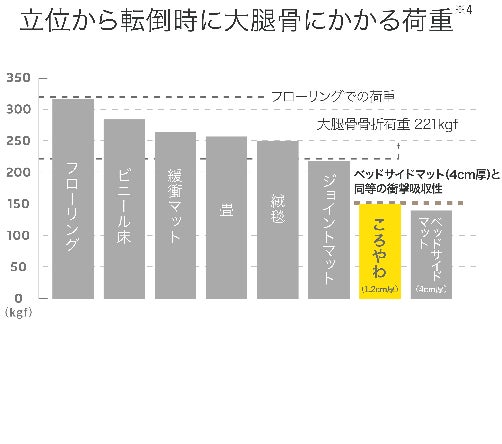 「ころやわ」は、これまで両立が困難とされていた「歩行快適性」と「衝撃吸収性」という2つの性質を合わせ持つ、今までにない構造を採用した、転んだ時には凹んで衝撃を低減しつつ普段は快適に歩ける新しい床材です。歩行困難に陥りやすい大腿骨の骨折は、高齢者の場合、221kgf以上の荷重がかかると発生するといわれています。「ころやわ」を敷くだけで150kgf程の荷重に低減でき、大腿骨の骨折リスクは大幅に低減します。