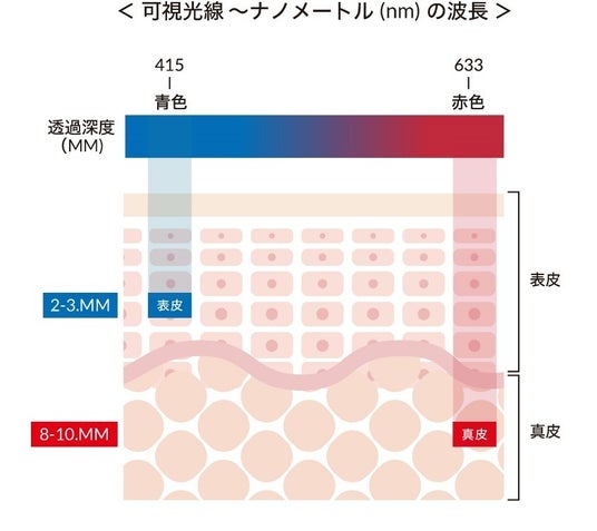 波長が長く肌の深い層に到達する赤色LED(633nm)は、肌に自然な刺激を与えることで適切にスキンケアするため、エイジングケア*に適したLED光です。赤色LEDよりも波長の短い青色LED(415nm)は表皮層に届くため、赤色LEDとの併用でより多様なスキンケアが可能となります。