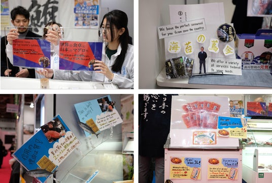 事前に横浜市中央卸売市場への取材を行い、今回出展した仲卸業者6店舗の商品やサービスの特色、強みをPRするチラシやPOPを作成。FOODEX JAPAN 2025の来場者にそれぞれの店舗の魅力を説明しながら手渡しました。