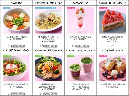 ジョイナスでは、春の訪れが感じられる色とりどりのメニューを揃えたグルメフェア「春の彩りグルメ」を開催いたします。各店舗から、いちご、桜えび、たけのこ、春キャベツ、はまぐり、抹茶など、春の味覚をふんだんに使ったメニューが登場します。