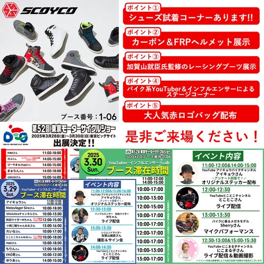 バイク用アパレル「SCOYCO」が東京モーターサイクルショー2025に出展! 新作カーボンヘルメットや人気シューズ等多く展示!バイク系YouTuber・インフルエンサー来場します!ロゴ入りバッグ配布も