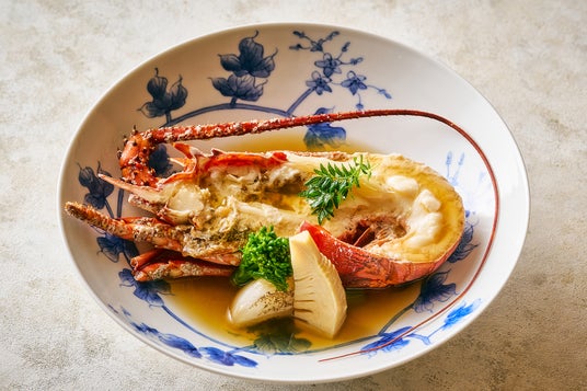 殻つきのまま煮つけた具足煮。具足とは甲冑を意味する言葉で、これに見立てたことから名付けられました。国産イセエビをこだわりの合わせ出汁で焚いた逸品です。