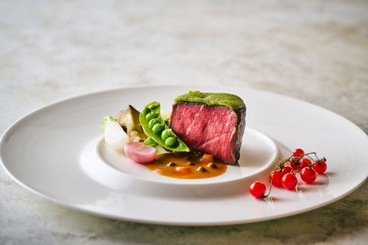 牛フィレ肉のポワレにフォンダンハーブ(柔らかなハーブバター)を合わせた爽やかな香りが楽しめる一皿。グリーンペッパー香るフォンドヴォーにクリームを合わせたオークラ伝統のソースで、さらに肉料理の味を上品に演出します。