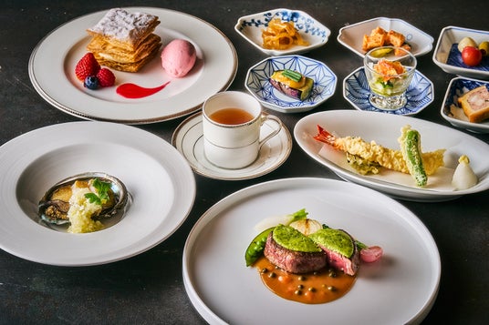 和食からは季節の食材にこだわった「旬の天ぷら盛り合わせ」、中国料理からは深い香りと風味が楽しめる「蝦夷鮑の葱・生姜風味蒸し」、洋食からは「オークラ伝統のコンソメスープ」や、見た目にも美しい「牛フィレ肉のポワレ ハーブバターをのせて グリーンペッパーソース」をご提供。さらに、デザートには注文を受けてから焼き上げる「ミルフィーユ」をご用意します。一度に和・洋・中の『こだわりの逸品』をお楽しみいただける贅沢なディナーコースです。