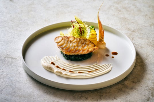 ジャガイモを鱗のように美しくまとわせ、香ばしく焼き上げたフランス料理の伝統的な逸品。イトヨリ鯛の柔らかな食感とジャガイモのクリスピーな対比が楽しめます。舌平目からとったヒュメドポワソンと白ワインを煮詰め旨味を凝縮したソースに、マデラソースを加え、2種のソースが織りなす奥深い味わいを堪能いただけます。