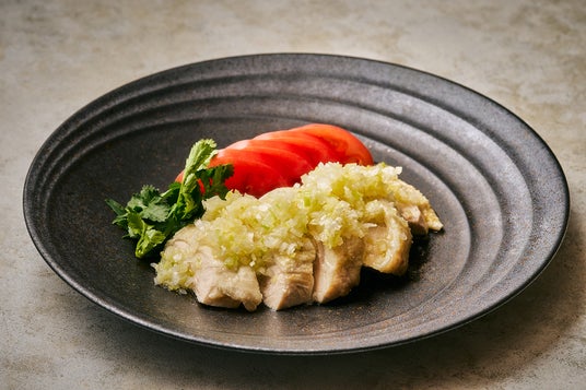 丸鶏を1時間蒸しあげ、塩味のタレに漬け込みました。しっとりとした味わいが楽しめるほか、丸鶏のため様々な部位が召し上がれます。生姜たっぷりの葱ダレが蒸し鶏の味を引き立てます。