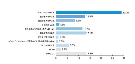 本質問の回答では、最も重視されているのは「きれいに染まる事」で、29%と3割近い方が選んでいます。次に「簡単にできること」の13.1%、僅差で「髪が傷まないこと」12.9%が続きます。つまり多くの方が白髪染めの製品について「きれいに染まって、簡単にできて、髪が傷まないこと」を望んでいるといえるのではないでしょうか?