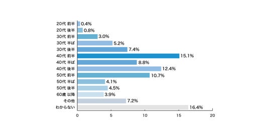 本質問への回答では、「わからない」と答えた方を除くともっとも多かったのが、40代前半で15.1%次に、40代後半が12.4%、3番目が50代前半の10.7%です。早めの方がアラフォー、遅い方でもアラフィフには白髪染めを始めているようです。